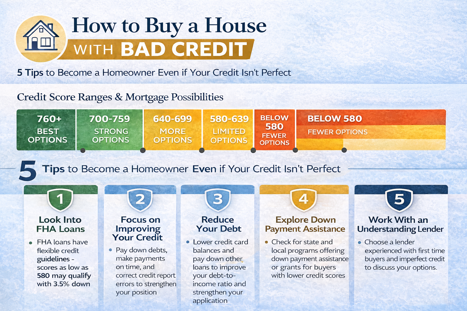 Visual Idea: Simple infographic showing five steps to improve credit before buying a home.